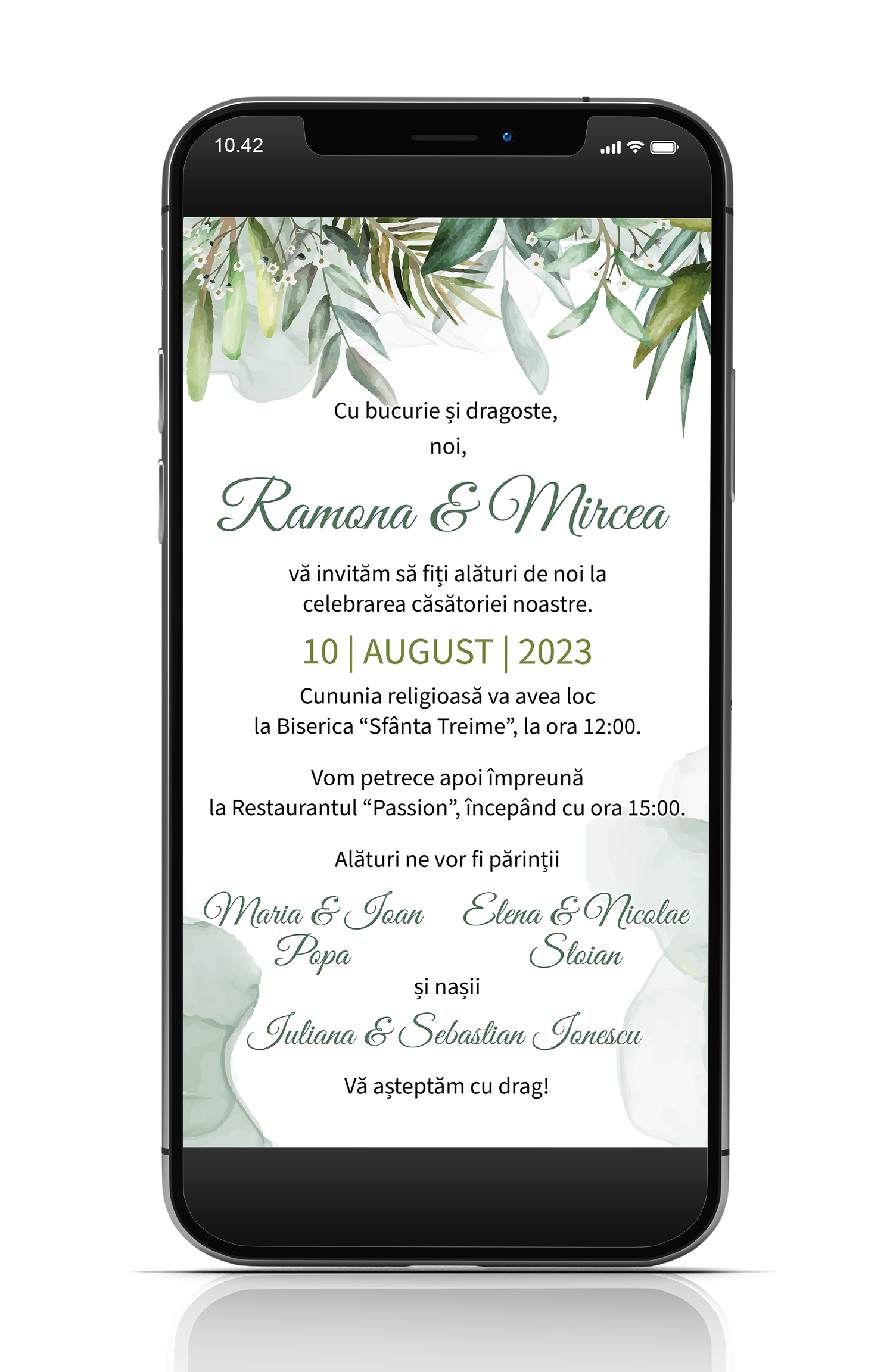 Puteti comanda aici o invitatie pentru nunta in format digital pe care o puteti trimite online pe email, telefon sau social media – facebook, instagram, tiktok, etc.
