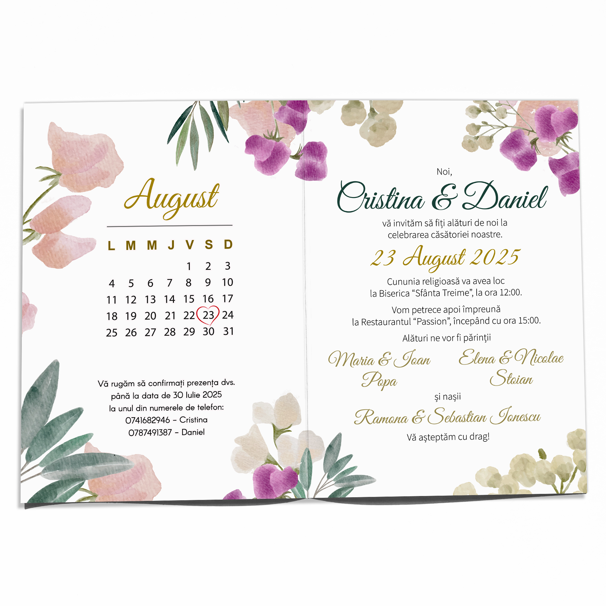 Fiecare invitație este concepută pentru a impresiona, combinând tradiția cu un strop de modernitate. Florile, atent alese pentru design, simbolizează dragostea și unitatea, creând o atmosferă romantică și caldă. Dimensiunile invitațiilor permit includerea tuturor informațiilor necesare, fără a compromite aspectul elegant și ordonat.
