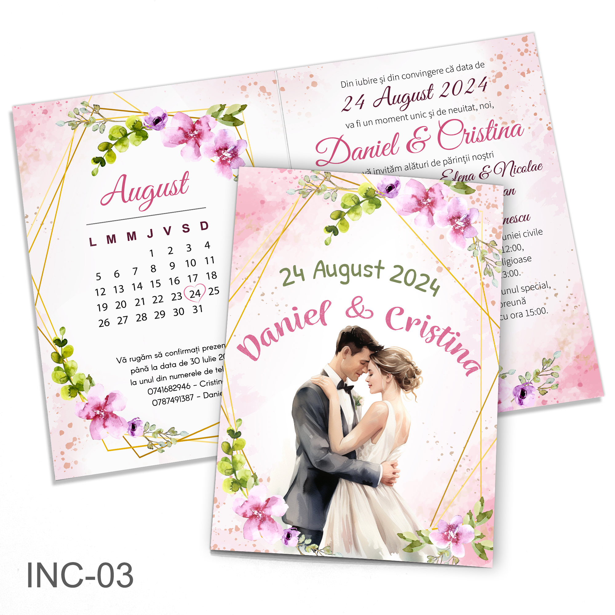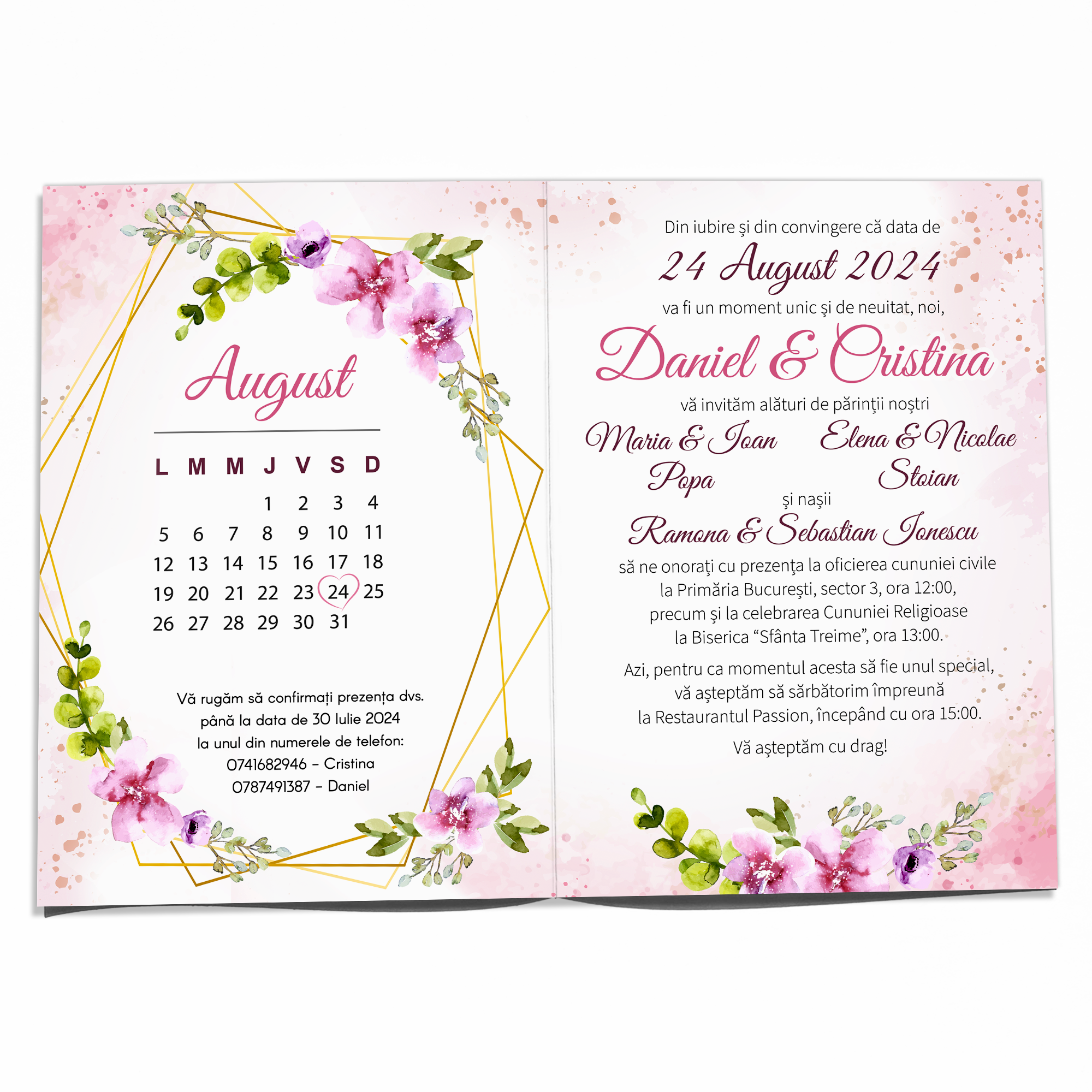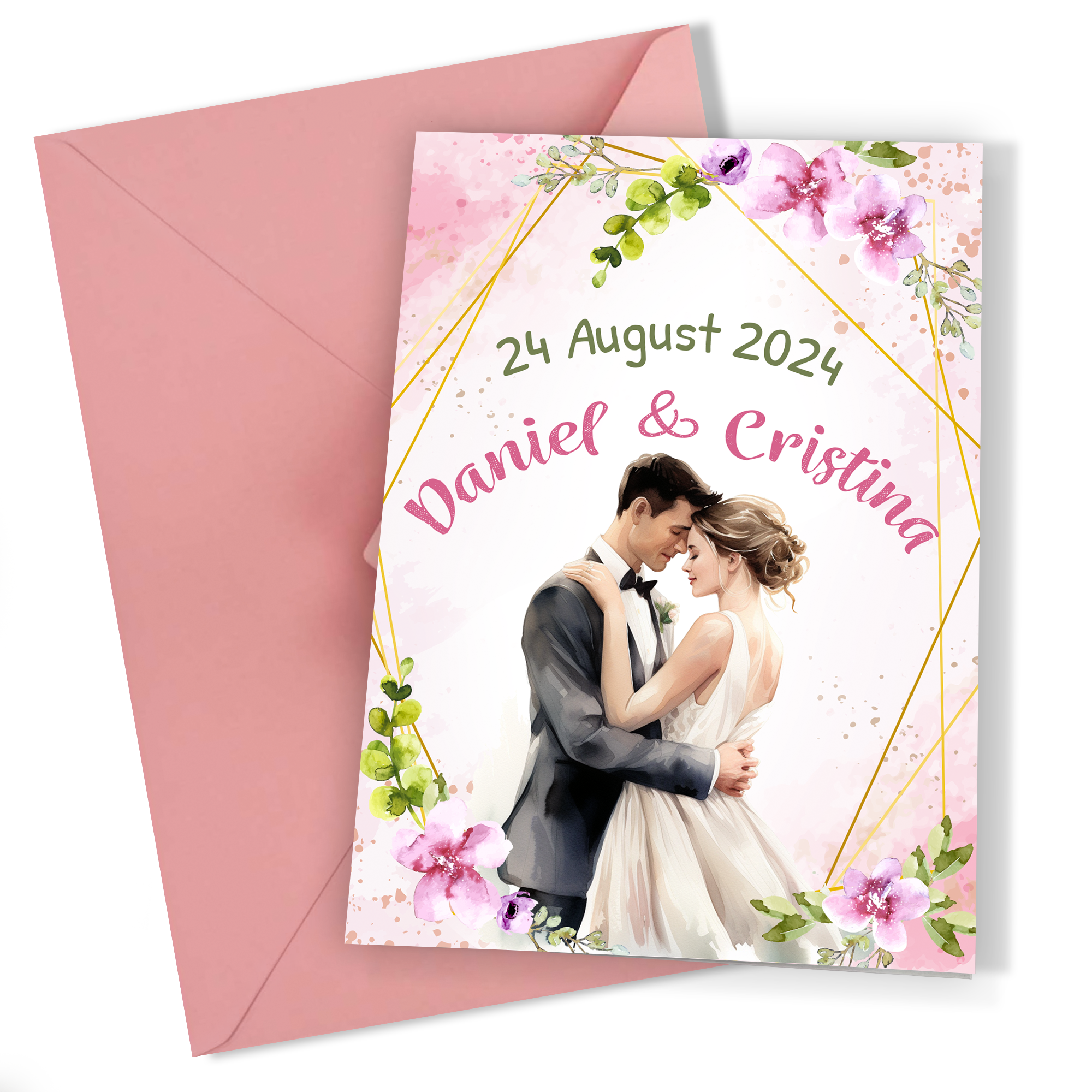 Invitațiile de nuntă cu dimensiunea A6 (închis) și A5 (deschis) reprezintă alegerea ideală pentru cuplurile care caută eleganță și rafinament. Aceste invitații sunt imprimate pe hârtie premium mată, oferind o textură plăcută și o calitate superioară la atingere. Designul lor este îmbogățit cu decoratiuni florale delicate, adăugând o notă de frumusețe și naturalețe anunțului vostru special.