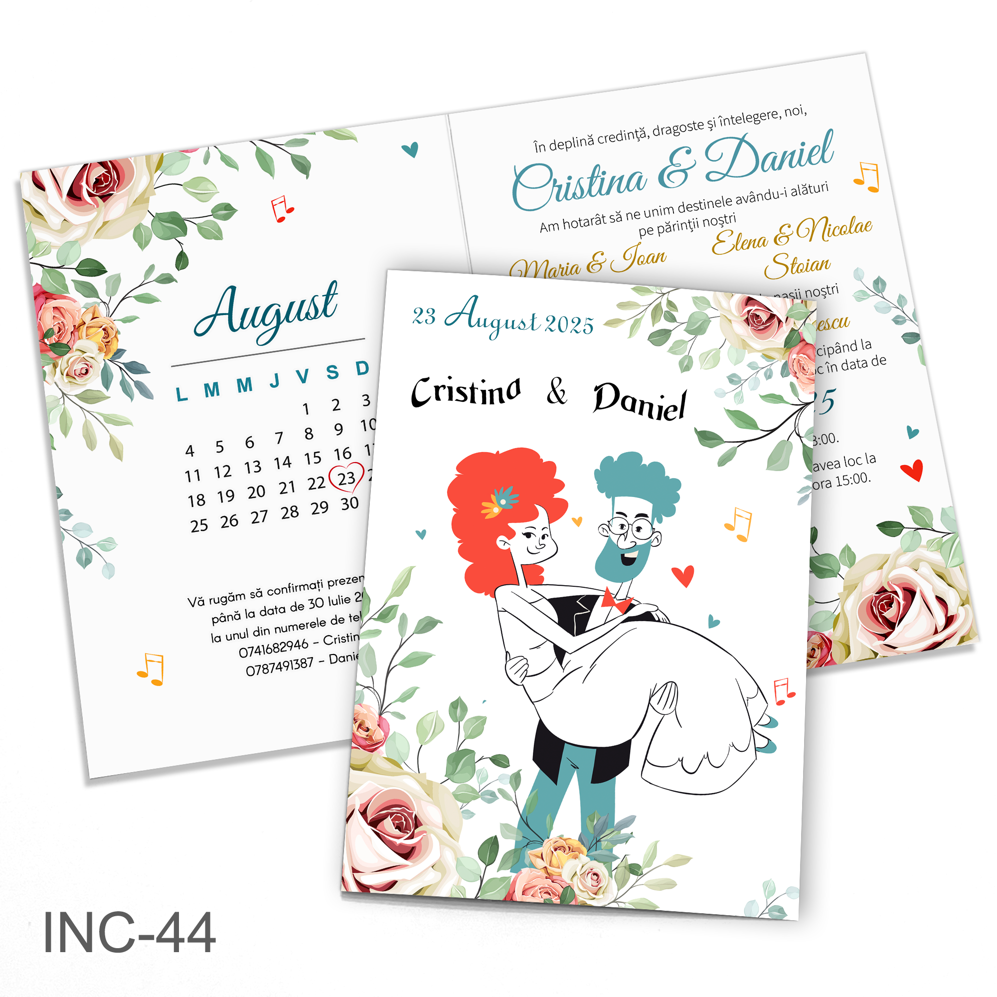 Cu dimensiunea A6 închis și A5 deschis, aceste invitații oferă spațiu suficient pentru creativitate și umor. Imprimate pe hârtie premium mată, calitatea lor este incontestabilă, iar textura mată adaugă o notă de sofisticare. Designul cu mire și mireasă stilizați transformă fiecare invitație într-o mică operă de artă, plină de personalitate și veselie.