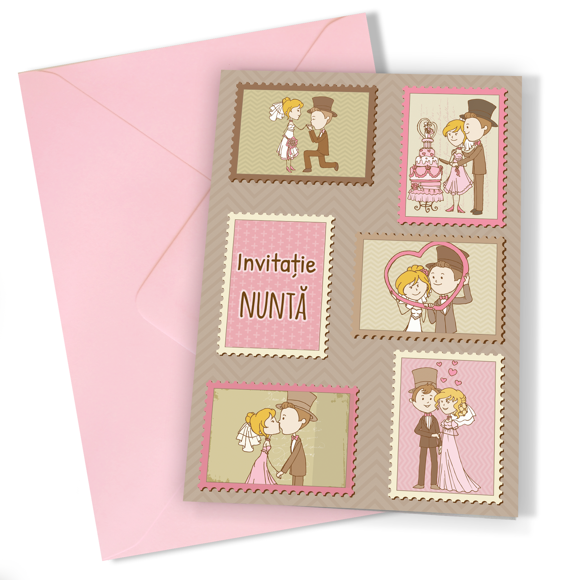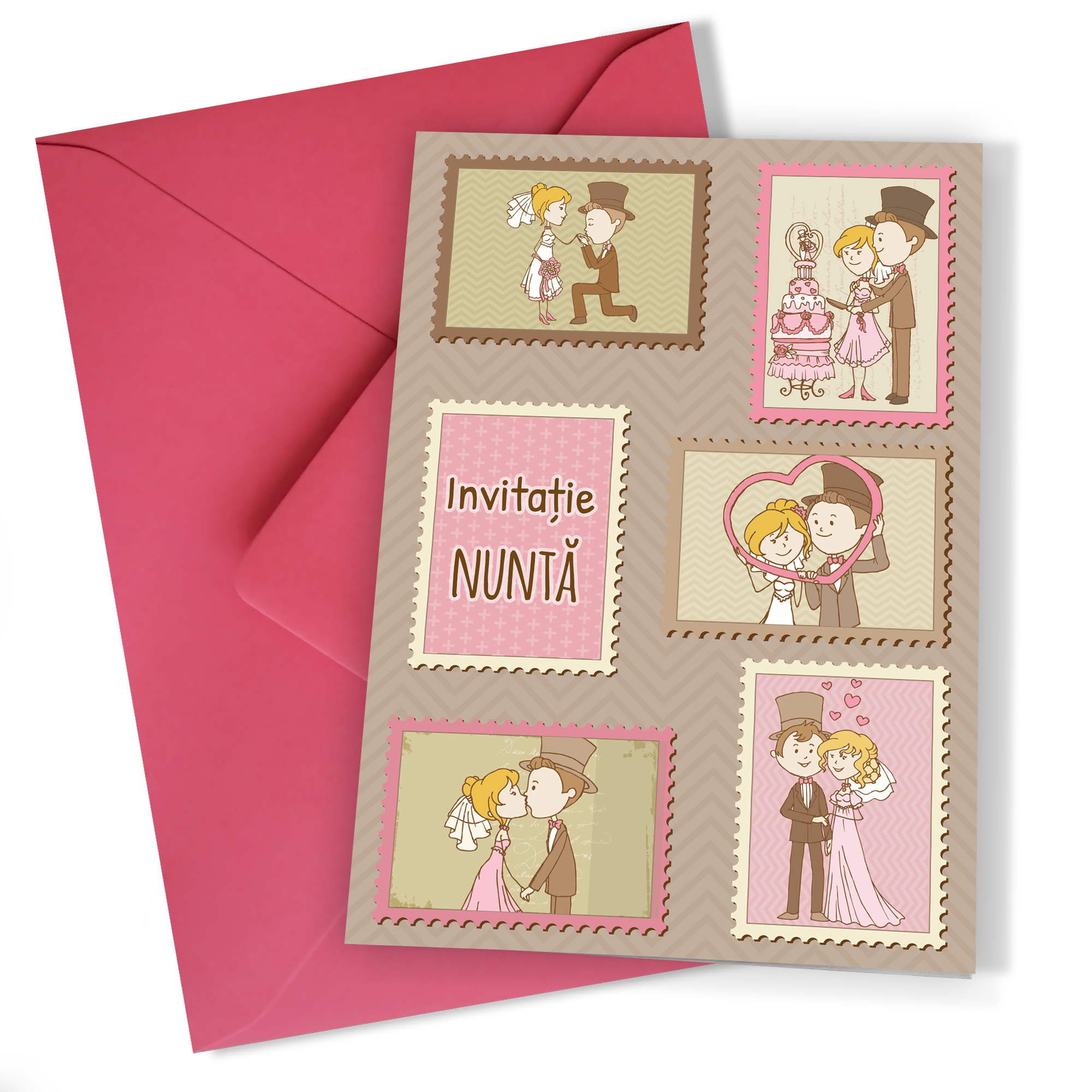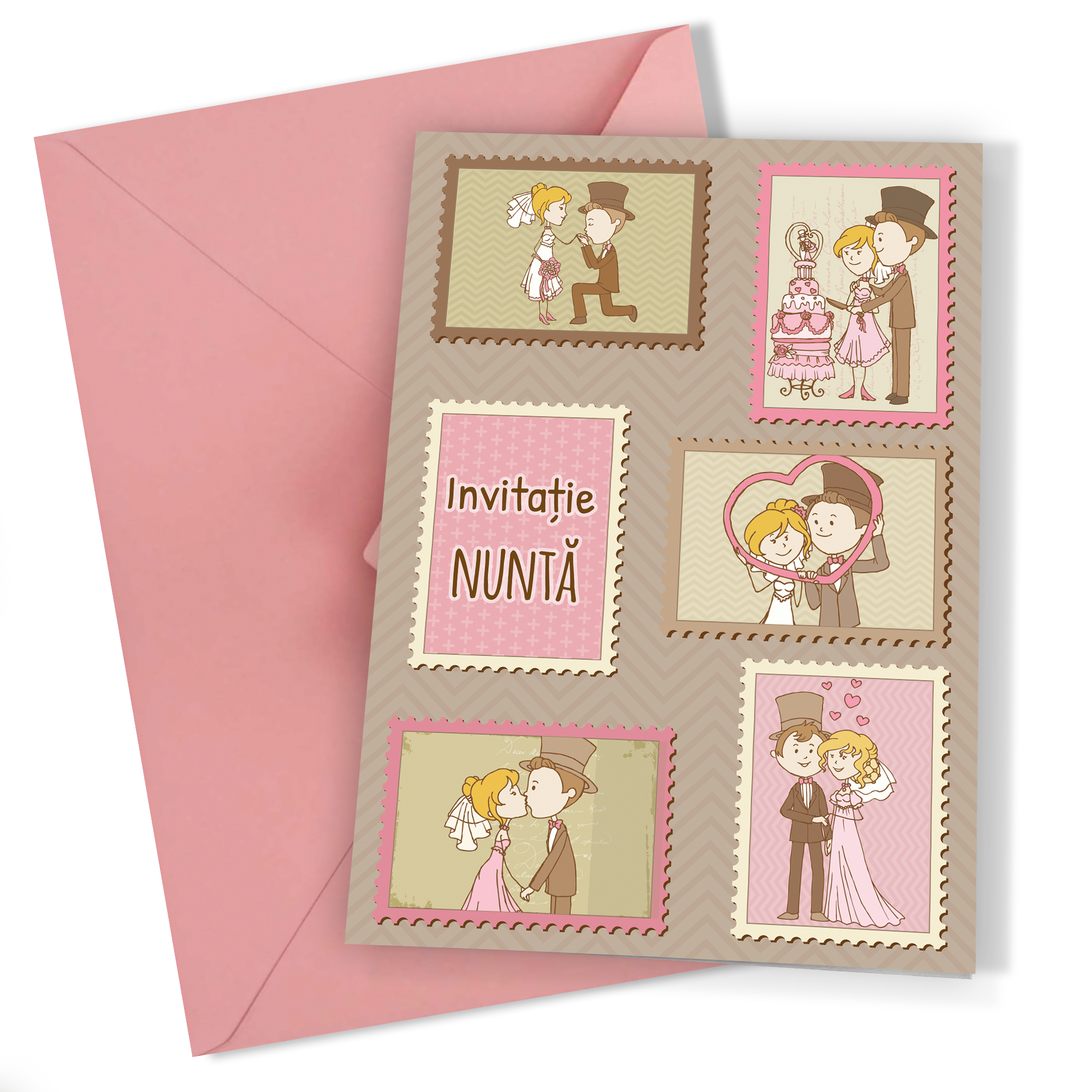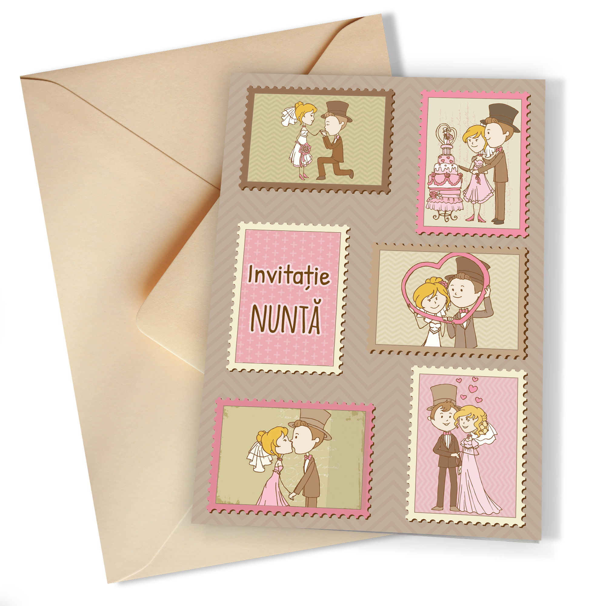 Cu dimensiunea A6 închis și A5 deschis, aceste invitații oferă spațiu suficient pentru creativitate și umor. Imprimate pe hârtie premium mată, calitatea lor este incontestabilă, iar textura mată adaugă o notă de sofisticare. Designul cu mire și mireasă stilizați transformă fiecare invitație într-o mică operă de artă, plină de personalitate și veselie.