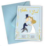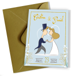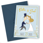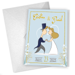 Cu dimensiunea A6 închis și A5 deschis, aceste invitații oferă spațiu suficient pentru creativitate și umor. Imprimate pe hârtie premium mată, calitatea lor este incontestabilă, iar textura mată adaugă o notă de sofisticare. Designul cu mire și mireasă stilizați transformă fiecare invitație într-o mică operă de artă, plină de personalitate și veselie.