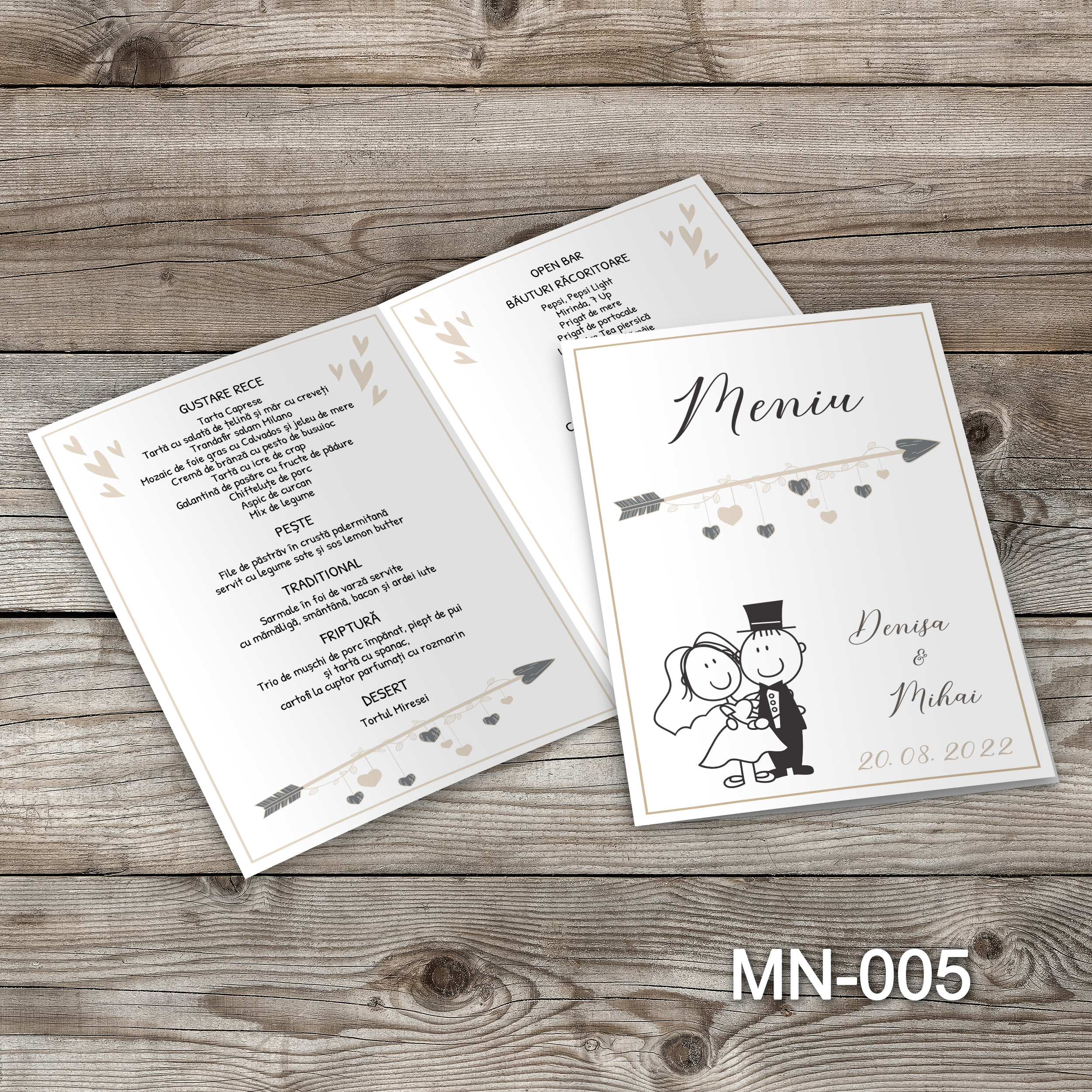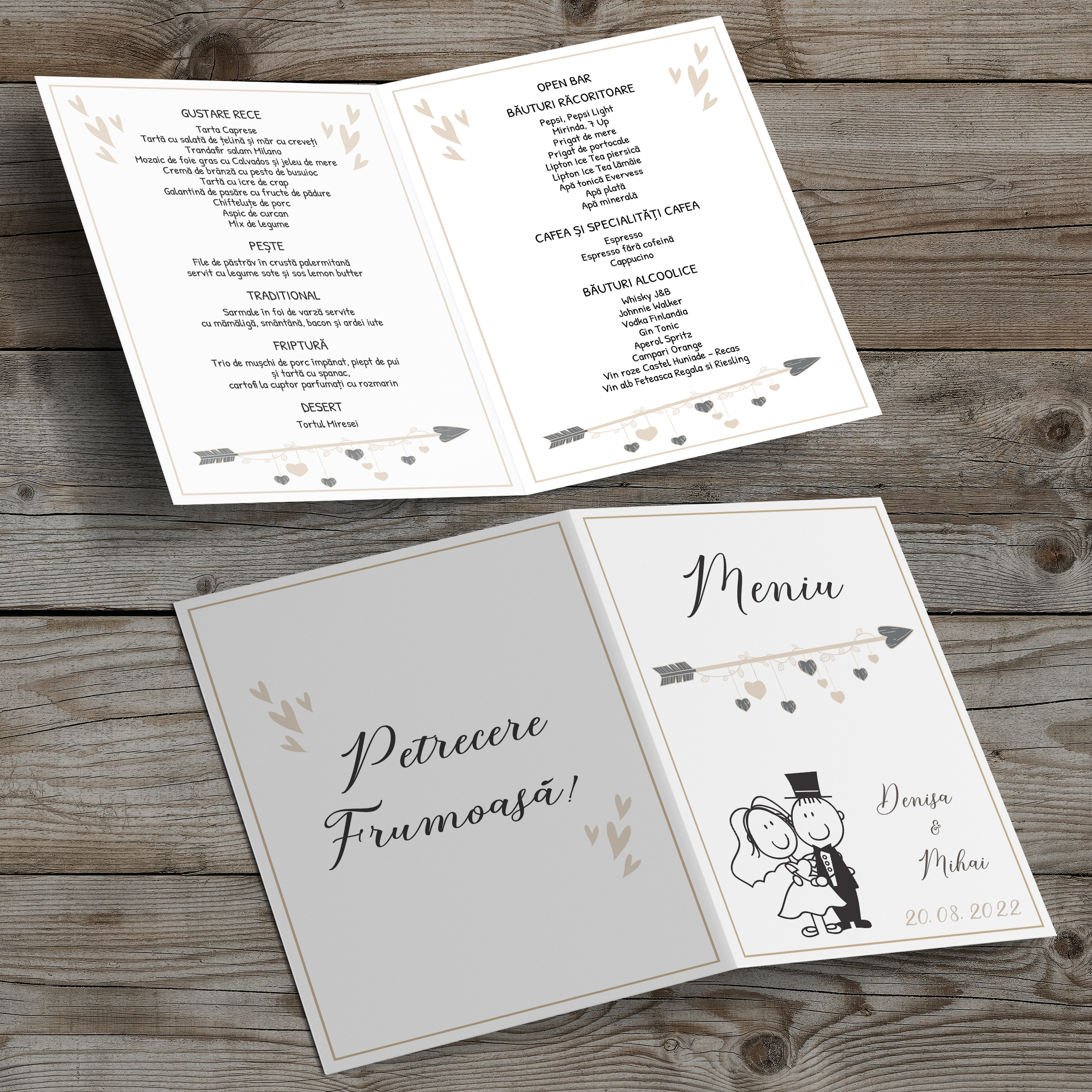 Meniurile pentru nunta tip carte sunt realizate din carton mat de 250g/mp.