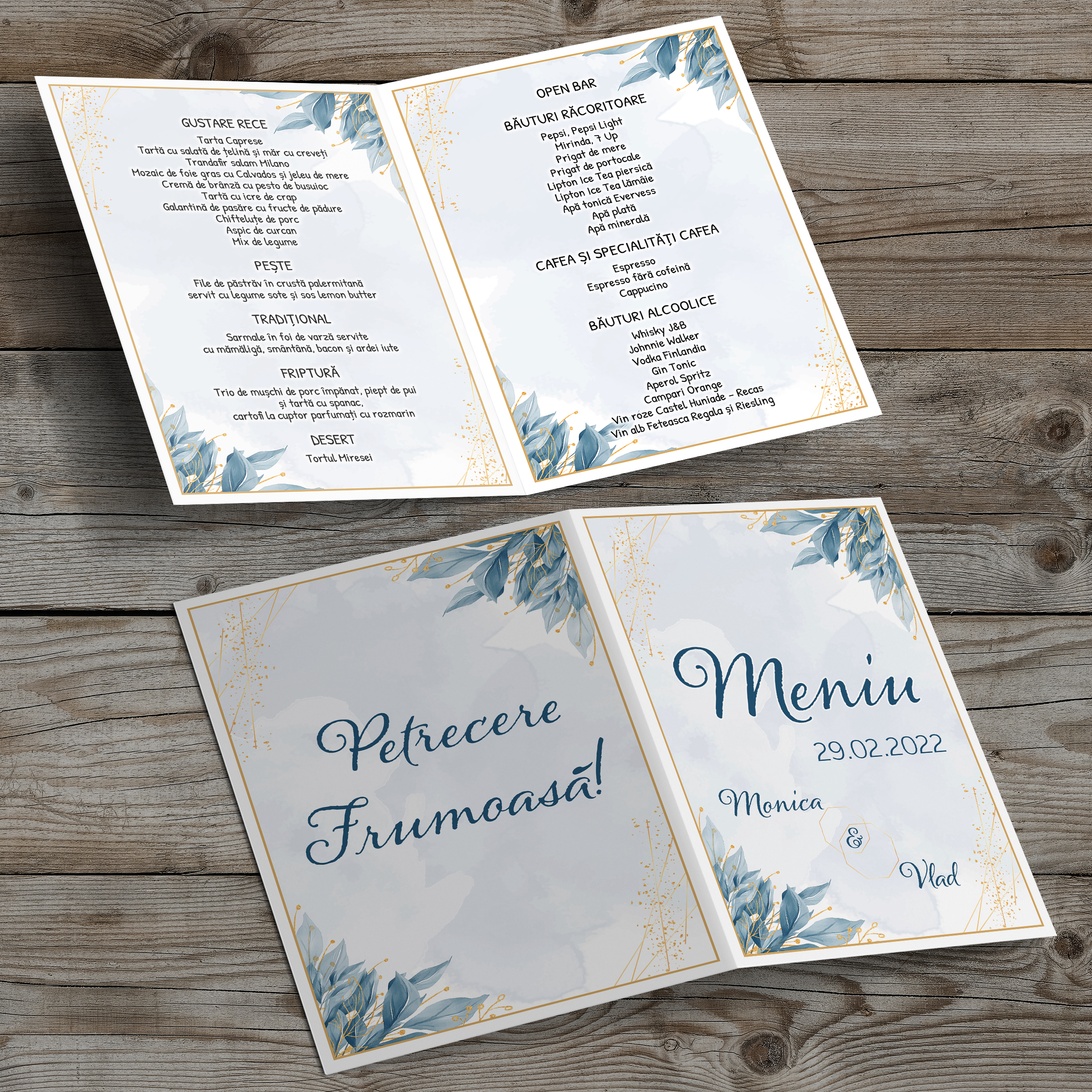 Meniu personalizat nunta tip carte, dimensiune A5 inchis / A4 deschis, print fata verso