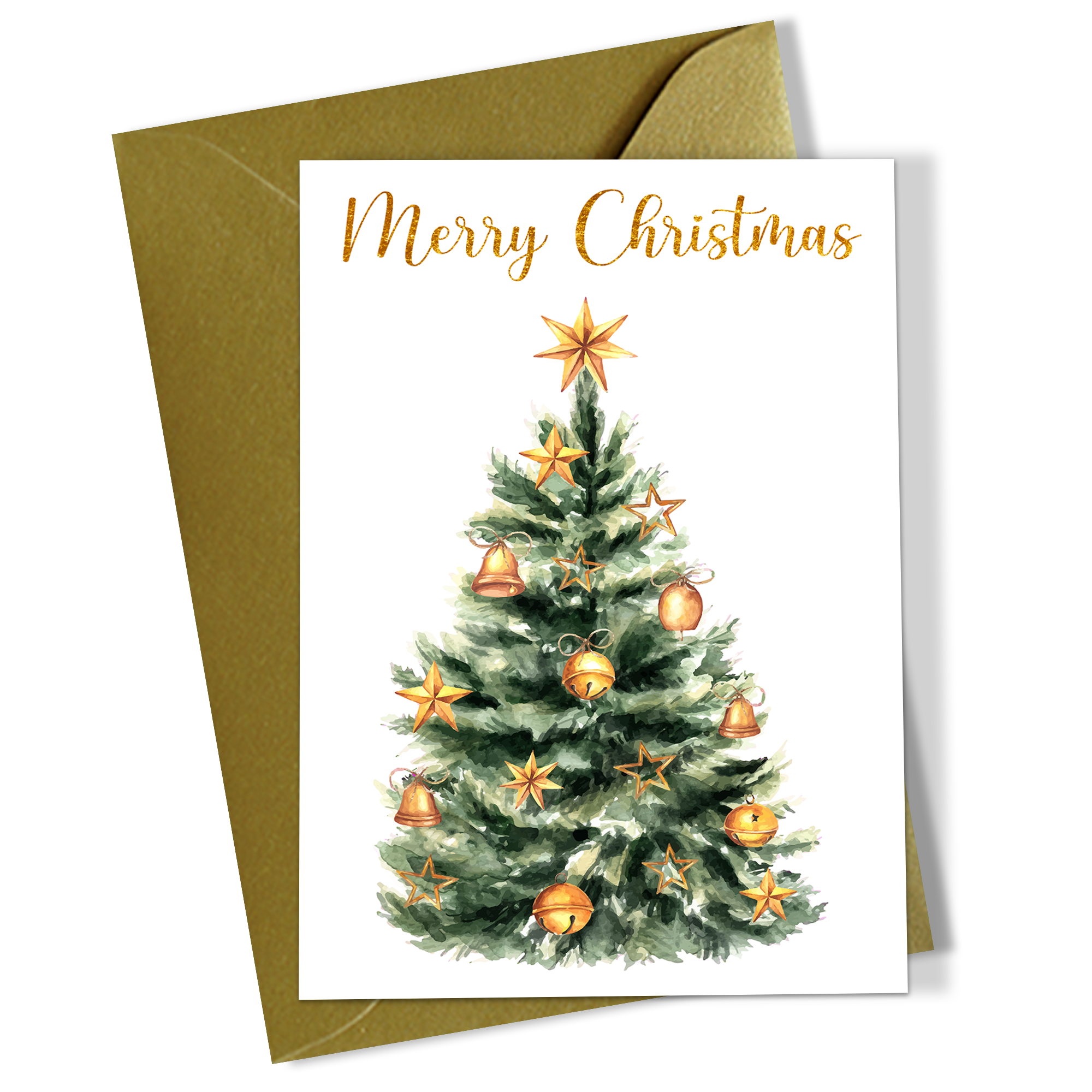Set 5 felicitari cu Merry Christmas 10×15 cm cu plic auriu inclus – Brad de Craciun – FC-126