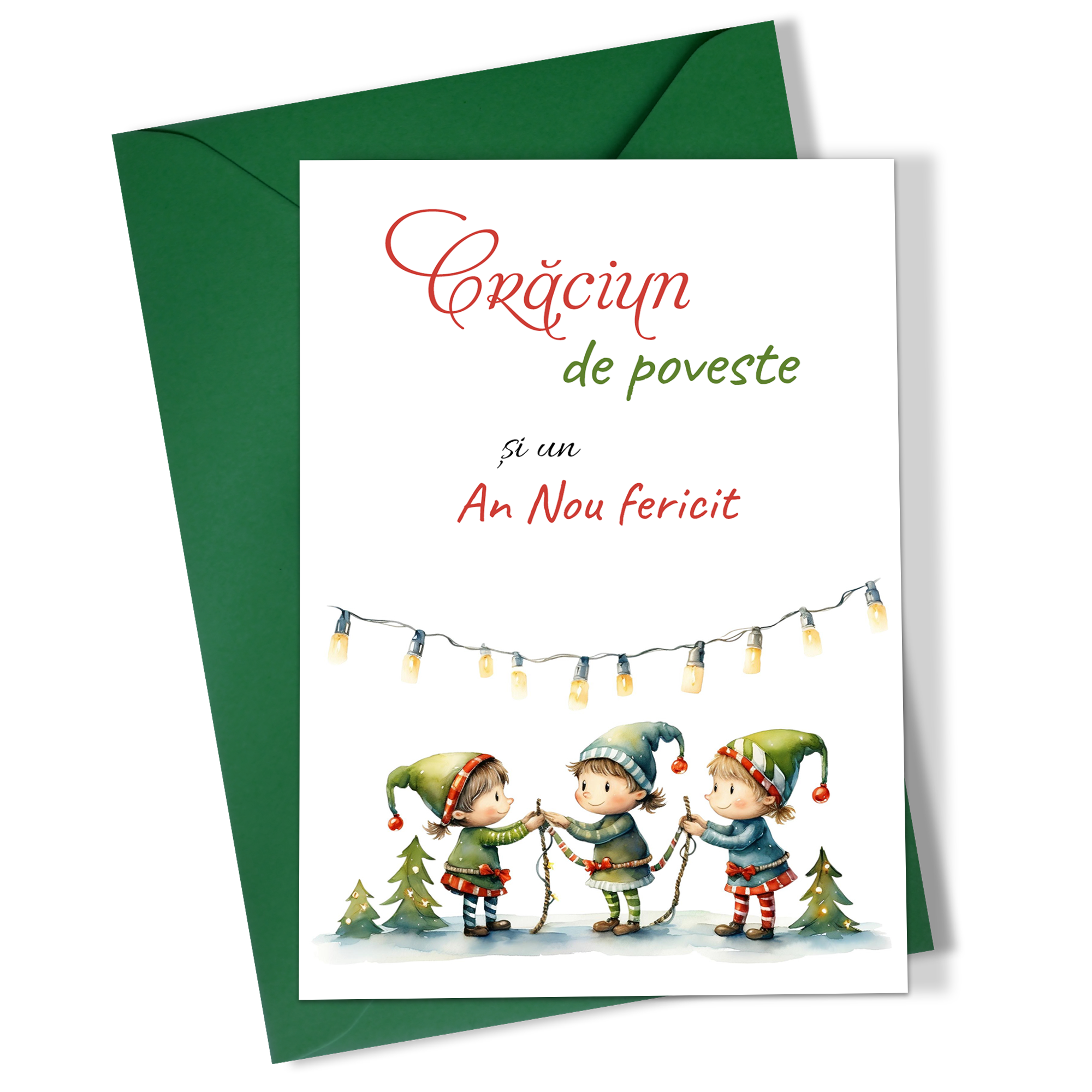 Set 5 felicitari de Craciun 10×15 cm cu plic verde inclus – Spiridusi – FC-106