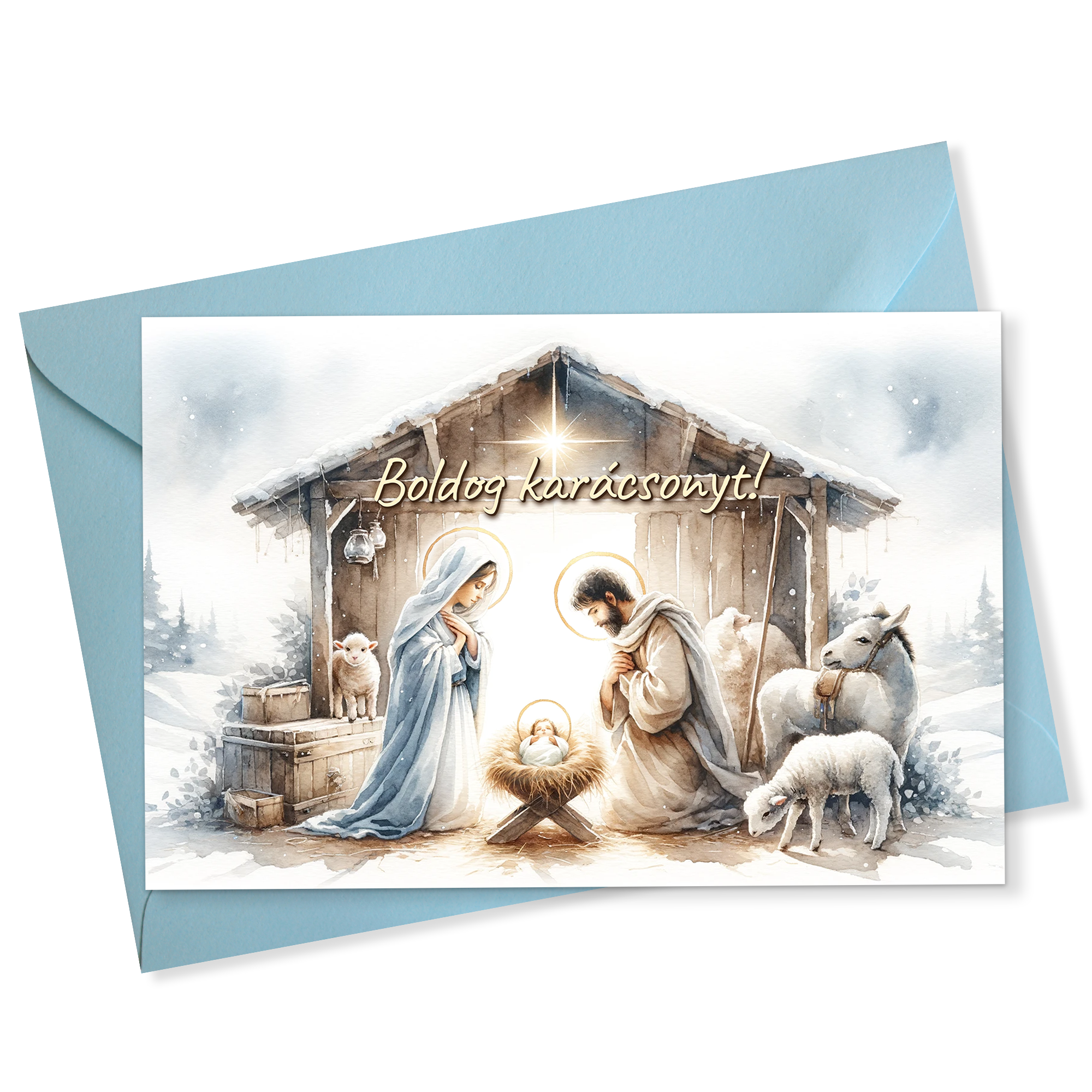 Set 5 felicitari de Craciun cu Nasterea Domnului in maghiara 10×15 cm cu plic albastru deschis inclus FC-65v