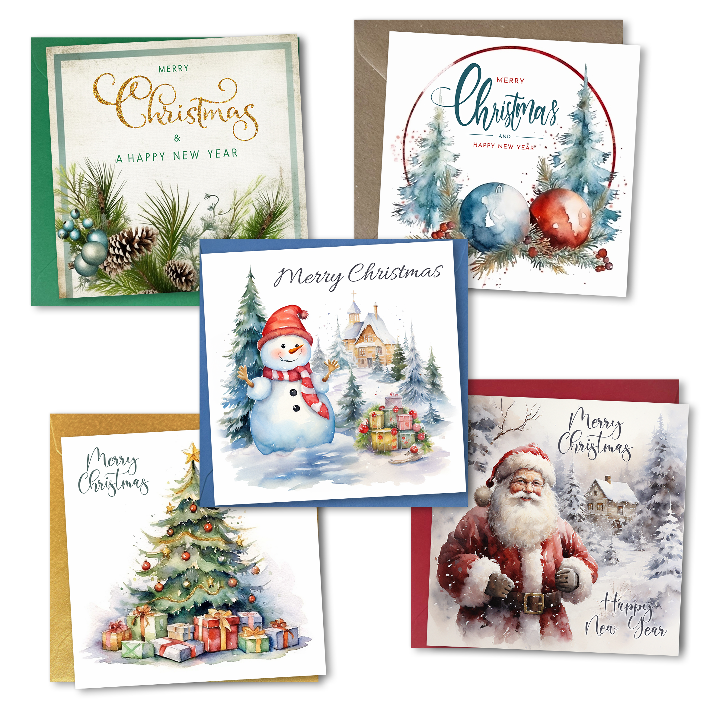 Acest set de 5 felicitări de Crăciun, cu dimensiuni de 13×13 cm, vine cu plicuri incluse, oferind o modalitate elegantă și personală de a transmite urări festive. Fiecare felicitare prezintă un design unic, capturând esența sărbătorilor de iarnă, de la peisaje însuflețite de zăpadă la simboluri tradiționale ale Crăciunului. Calitatea superioară a hârtiei asigură o scriere plăcută și o prezentare deosebită. Aceste felicitări sunt perfecte pentru a împărtăși magia și bucuria Crăciunului cu familia, prietenii și colegii.
